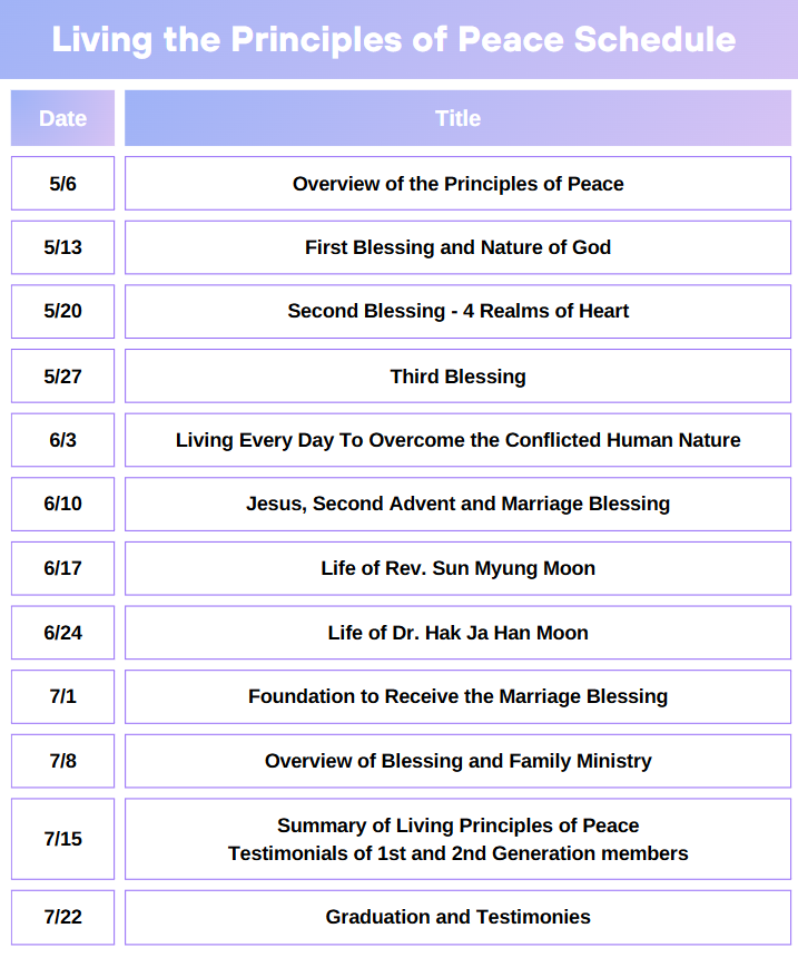 For who: Anyone that has received the Discovering the Principles of Peace seminar(or equivalent)