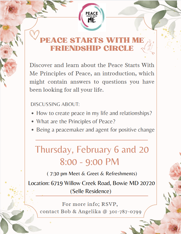 PEACE STARTS WITH ME FRIENDSHIP CIRCLE – starting up every other Thursday from January 9 till the end of March, offering the PEACE STARTS WITH