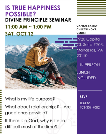 Join us for dinner, music, a Divine Principle presentation, open discussion and a lot of fun! Each week is a new topic from the Divine Principle.