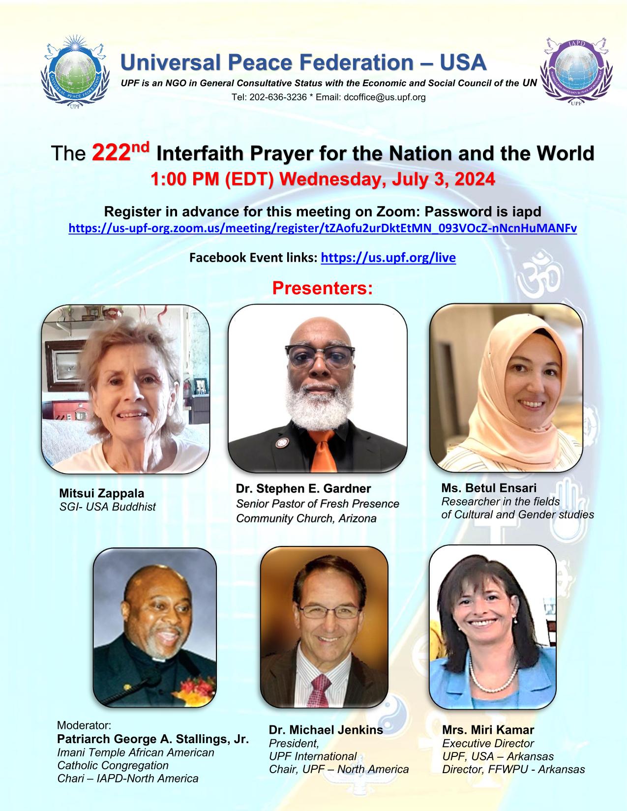ZoomIt is our pleasure to invite you to join us in the upcoming 222nd Interfaith Prayer for the Nation and the World.